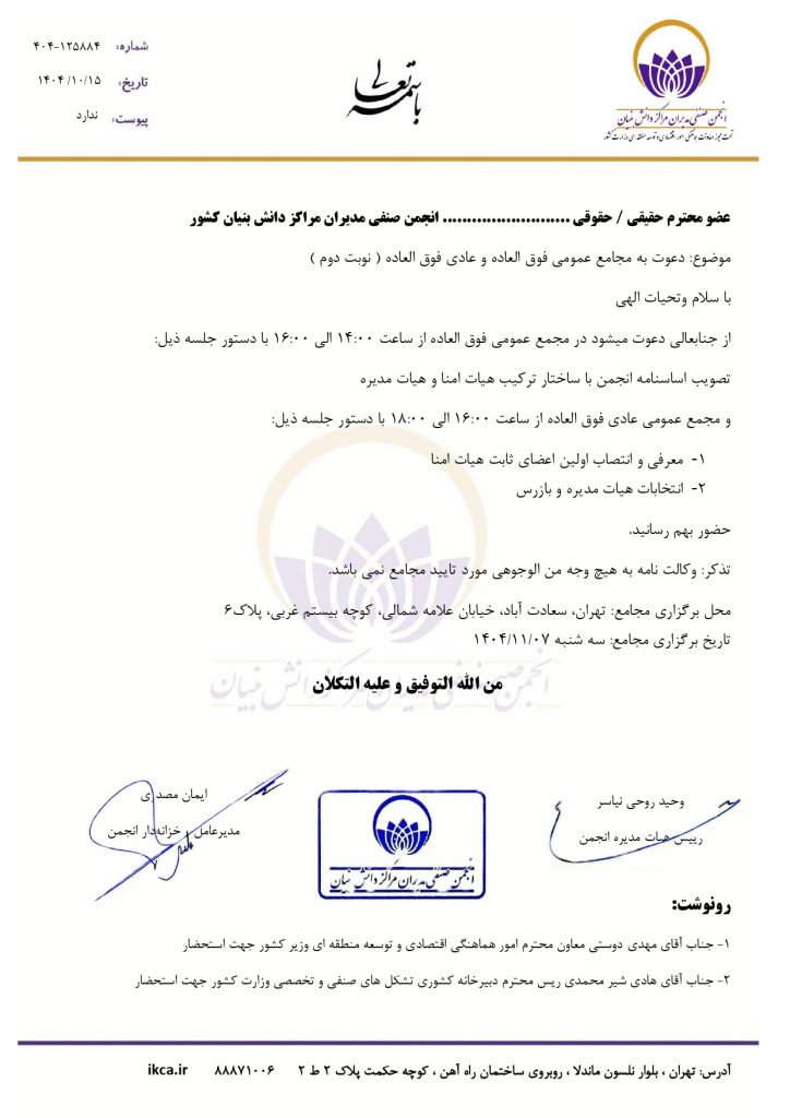اطلاعیه برگزاری مجمع عمومی فوق العاده انجمن View Larger Image اطلاعیه برگزاری مجمع عمومی فوق العاده انجمن توسط khosravi|2026-01-07T12:15:15+03:30ژانویه 7th, 2026|اخبار| برای دیگران هم ارسال کنید. FacebookTwitterLinkedInGoogle+PinterestEmail مطالب مرتبط سوء استفاده از نام انجمن صنفی مدیران مراکز دانش بنیان گالری سوء استفاده از نام انجمن صنفی مدیران مراکز دانش بنیان دسامبر 4th, 2018 | بدون دیدگاه برگزاری جلسه مشترک مابین انجمن و جامعه اسلامی مهندسین کشور گالری برگزاری جلسه مشترک مابین انجمن و جامعه اسلامی مهندسین کشور آوریل 11th, 2018 | بدون دیدگاه امضای تفاهم نامه همکاری انجمن با پارک علم و فناوری دانشگاه تهران گالری امضای تفاهم نامه همکاری انجمن با پارک علم و فناوری دانشگاه تهران دسامبر 12th, 2017 | بدون دیدگاه